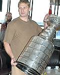 Хорошо отдохнуть главному действующему лицу торжеств в этот раз было не суждено — в полдень он вновь героически занял пост у завоеванного трофея, который красовался уже в парке Горького у входа в Крытый каток. Надо сказать, что хозяева арены подготовились к церемонии с похвальной тщательностью. Привлеченные толпой случайные зеваки, желавшие узнать о причине скопления народа, просто переадресовывались посвященными к стеклянному фасаду катка, на котором была размещена исчерпывающая информация об истории Кубка Стэнли и приводились любопытные факты его более чем вековой биографии. Неподалеку же от притягивающего всеобщее внимание постамента детвора с удовольствием разминалась на хоккейном тренажере, пытаясь с плексигласового “льда” забросить шайбу в установленные тут же ворота, заслоненные макетом вратаря. И на сей раз церемония не уложилась в оговоренный сценарием регламент: сворачиваться было решено, когда время приближалось к двум часам пополудни (против заявленных 13:00). Однако и тут терпение не успевших запечатлеть себя на фоне серебряной чаши было учтено, а в программу внесено очередное дополнение: около шести вечера приз еще на час был выставлен у крыльца все того же “Легиона” и также не страдал от равнодушия прохожих…