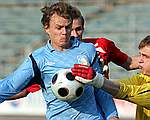 Что ж, было бы как минимум нескучно. Со стартовым свистком соперники вынесли на суд болельщиков, проявивших похвальную для буднего дня активность, веселый обоюдоострый футбол. Причем бразды правления в свои руки на правах хозяев взяли торпедовцы, у которых защиту гостей при пособничестве Брусникина с особым рвением терроризировал их бывший соратник по ратному делу Беганский. Дружинники Эдуарда Малофеева ответили небезопасной пристрелкой крайков — Балановича и урожденного жодинца Гренькова. Но в общем и целом до антракта подопечные Александра Бразевича чаще подбирались к чужим владениям, нежели охраняли свои. Во всяком случае, Курскис находился в тонусе постоянно, а сменивший Бушму из-за травмы руки Паречин вступал в игру реже.