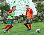 Вечерние тренировки игрокам, безусловно, нравятся больше, чем утренние. Просто потому, что на них преимущественно идет активная работа с мячом, а также непосредственно игра. Например, Ирмшер предлагает подопечным в позе краба как можно больше и чаще набивать мяч попеременно обеими ногами. А Штанге комментирует: “Корниленко! Томск, Сибирь, морозы, холодно. Молодец!” Или так — необходимо, набивая мяч лежа на траве, резко подняться и поймать его на ногу. “Кри-вец!” — с ударениями на оба слога выделяет лучшего Штанге.