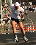 Нечто подобное происходило и в лыжероллерных заездах. Любители могут быть и не в курсе, но чемпионаты мира по лыжероллерам давно завоевали себе место в профессиональном спорте, востребовав к жизни соответствующую индустрию. В последней, по свидетельству специалистов, особенно выделяются итальянские фирмы, выпускающие продукцию, на которой страшно было бы выехать на раубичскую трассу с ее захватывающими дух поворотами. Но зато на ней есть где разгуляться по проспекту Победителей, чем и воспользовались самые продвинутые участники. (Стоимость пары, зависящая от качества подшипников и полиуретановых колес, — долларов под двести.) Наши лыжники и биатлонисты тренируются, как правило, на гораздо более медленных роллерах, финских и норвежских, чья скорость качения все-таки сравнима со скоростью скольжения лыжной поверхности (но и здесь возможны большие расхождения). Добавим, что еще более тихоходными являются платформы с колесами, предназначенными для “классического” хода, где необходимо фиксировать жесткое отталкивание назад. На них встали те, кто не рискнул поехать на ускользающих из-под ног узеньких площадках — враскачку, имитируя движения конькового хода. Все упомянутые нами модификации (плюс роликовые коньки, на которых, к примеру, птицей летел лучший нападающий президентской хоккейной команды Андрей Асташевич, директор спорткомплекса “Раубичи”) и были задействованы в соревновании, где народ упирался, как показалось, до зайчиков в глазах и даже, как выяснилось, до сломанных палок.