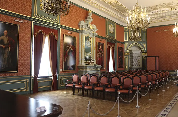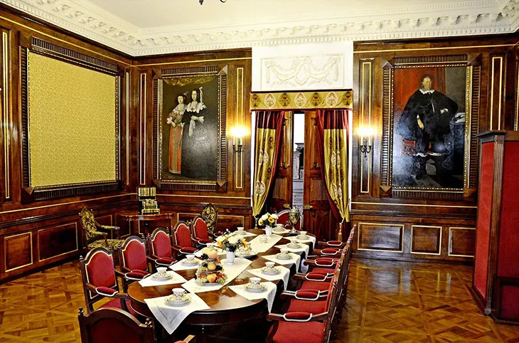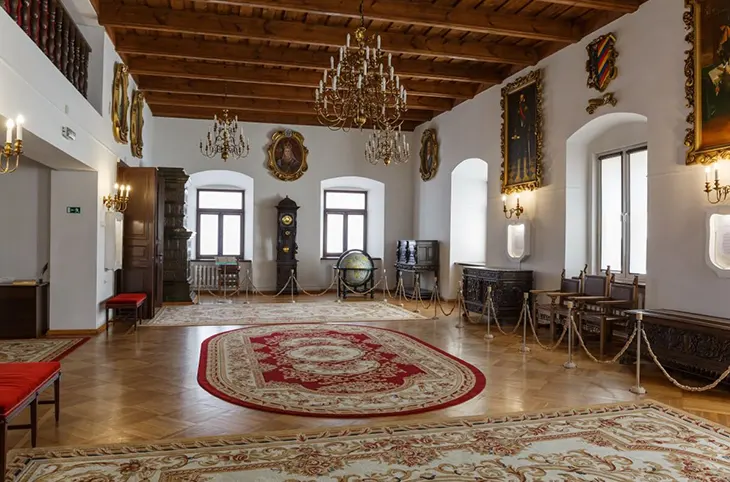Особой роскошью отличались интерьеры замка: около 300 покоев и 12 парадных залов, каждый с уникальным убранством. Паркеты из 140 пород дерева, позолоченные балюстрады и фаянсовые печи отражают роскошь, которой славилось семейство Радзивиллов.