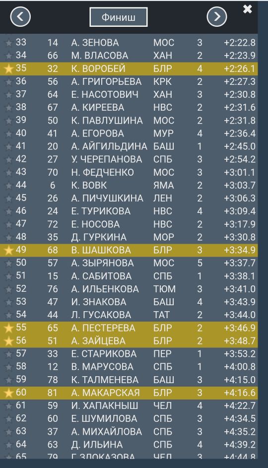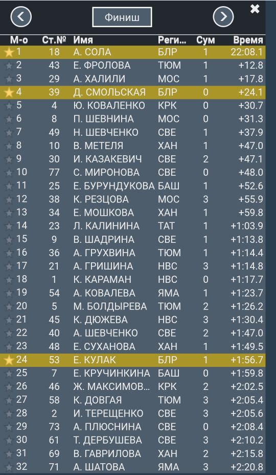 Еще одна белоруска Динара Смольская финишировала на четвертой позиции, отстав от Солы на 24,1 секунды и закрыв все мишени.