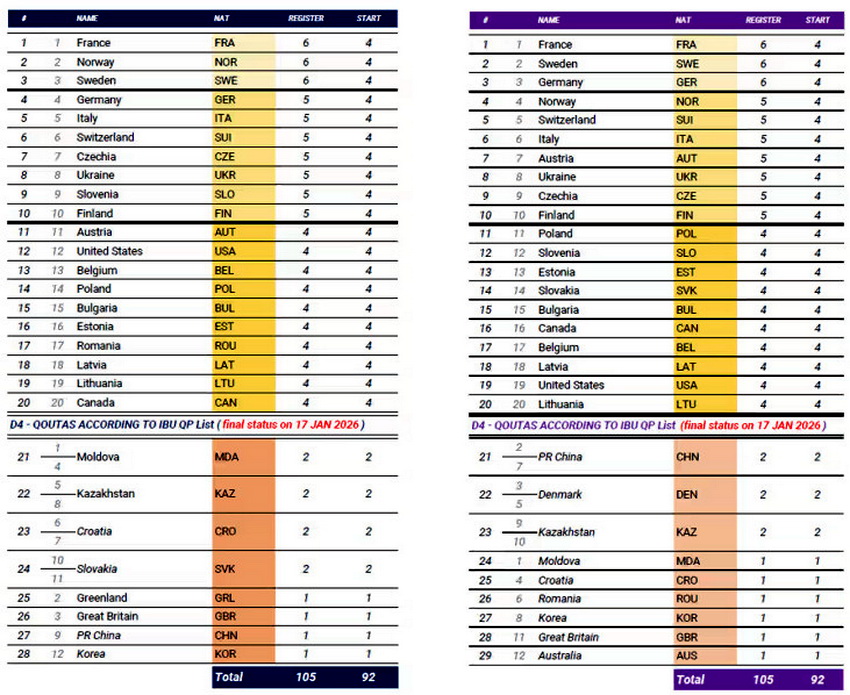 18 января Международный союз биатлонистов (ИБУ) опубликовал окончательный список олимпийских квот — с учетом добора по кубковым очкам 12 мужчин и 12 женщин тех сборных, которые не попали в двадцатку Кубка наций.