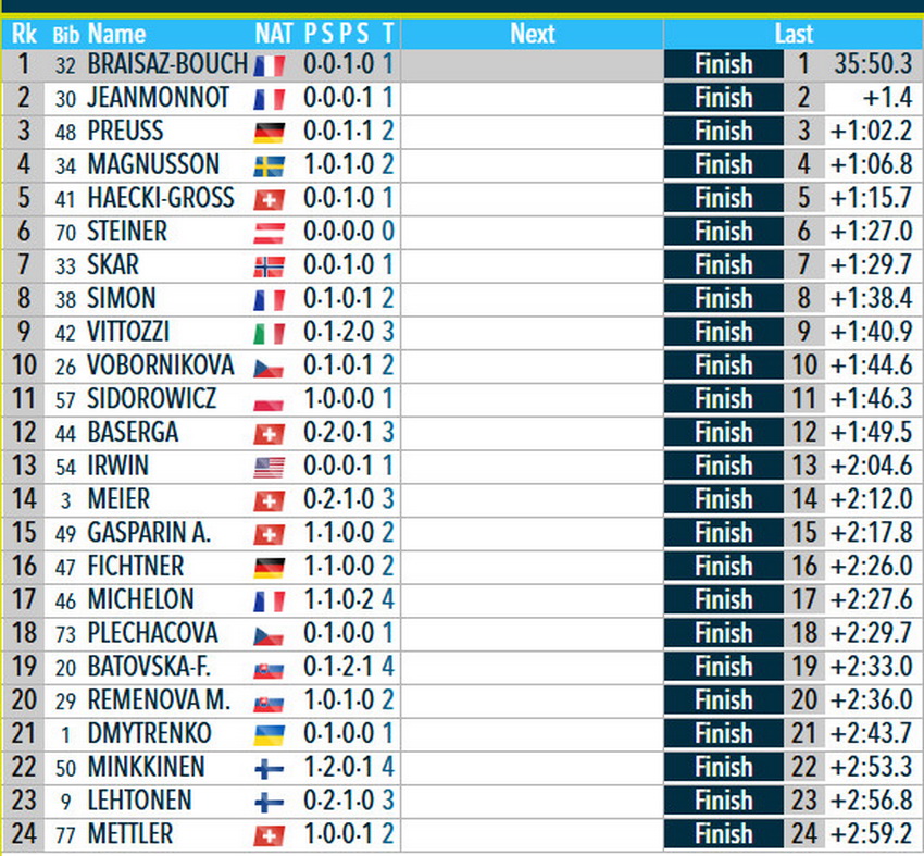 В женской индивидуальной гонке победу одержала француженка Жюстин Бреза-Буше, заработавшая всего один промах.