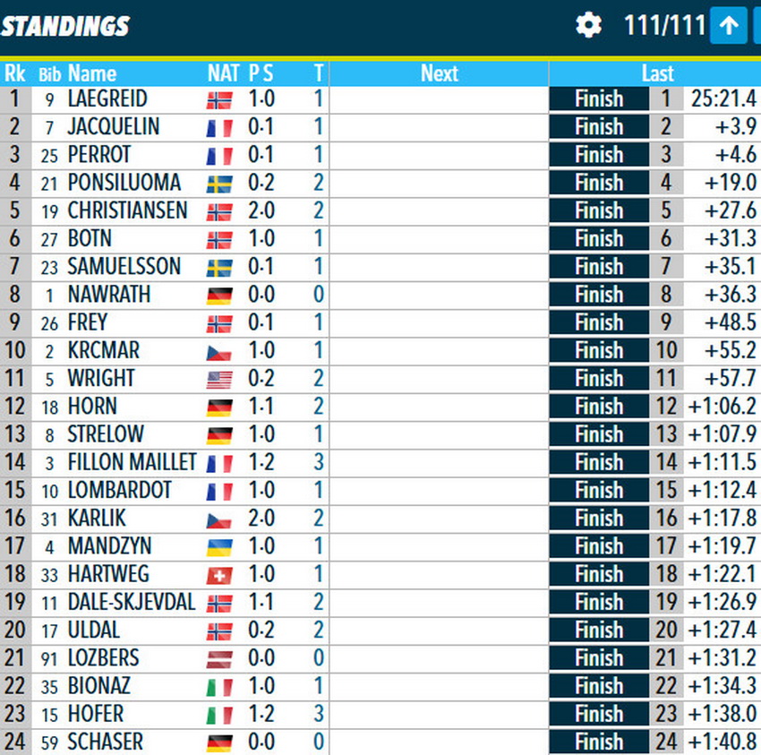 - Стурла Холм Легрейд (Норвегия) — 25.21,4 (1 промах).