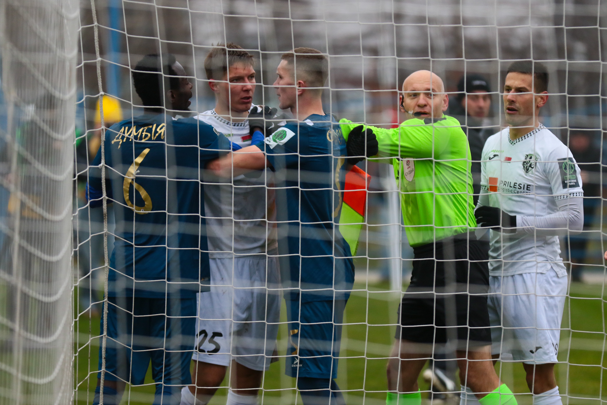 Хотя, когда время вылилось за компенсированные ко второму тайму три минуты, Василючек неуклюже справлялся с ударом со «второго этажа» Олалейе. Судорожные движения голкипера «медведей» примагнитили к нему центрдефа «Ислочи» Тихомирова, коленом все же отправившего мяч за линию ворот. Правда в том, что как положено мяч в руках зафиксировать Василючек не смог. Другое дело, что в борьбе контакт забившего с вратарем тоже имел место… Думается, по этой причине Никита Шиян гол не засчитал, а за проявление бурного негодования щедро наградил наставников хозяев: де-факто главкома Комаровского — красной карточкой, его помощников Сергея Концевого и Антона Ковалевского — желтой. За те же грешки отхватили по «горчичнику» и футболисты «Ислочи» — Юдчиц и Пацко.