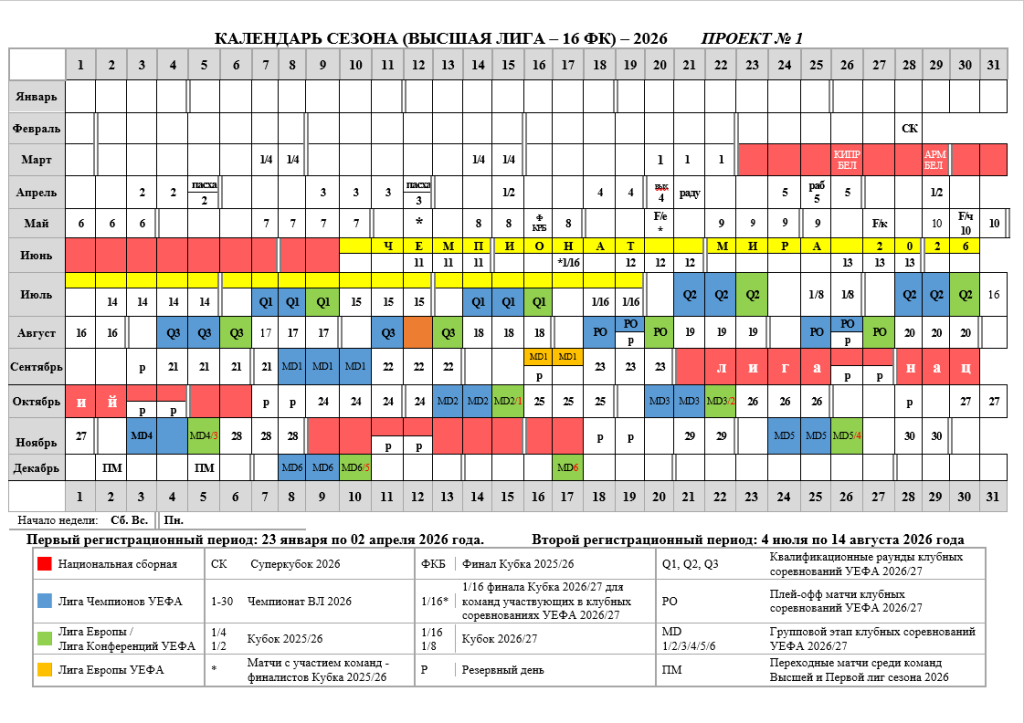 Решением Исполкома АБФФ был выбран цифровой календарь на сезон 2026 года, согласно которому первый тур Betera-высшей лиги чемпионата Беларуси по футболу будет сыгран с 20 по 22 марта. Последний, 30-й тур, состоится 28-29 ноября.