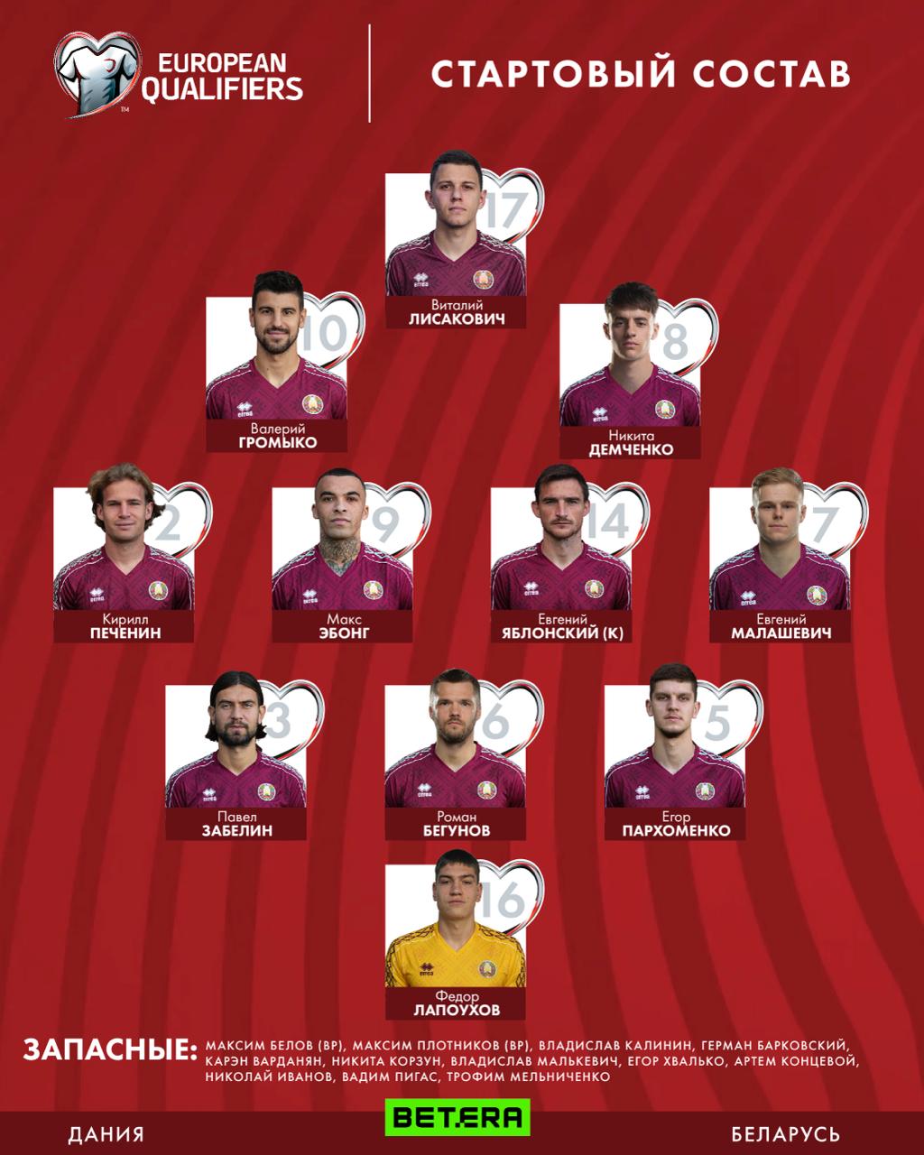 БЕЛАРУСЬ: Лапоухов — Забелин, Пархоменко, Бегунов, Печенин, Яблонский (к), Эбонг, Малашевич, Демченко, Громыко, Лисакович.