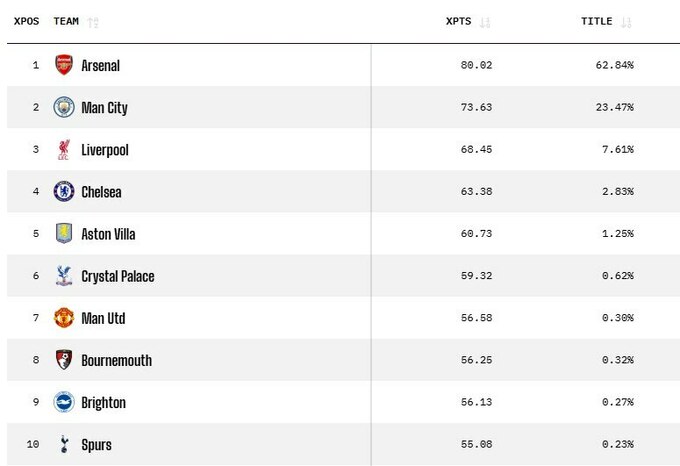 Суперкомпьютер считает, что обладателем титула станет лондонский «Арсенал» под руководством главного тренера Микеля Артеты, который наберет 80 баллов.