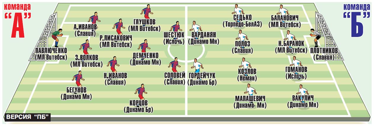 КОМАНДА «А»: Павлюченко — А.Иванов, З.Волков, Бегунов — Р.Лисакович, Н.Иванов — Глушков, Демченко, Корцов — Шестюк, Соловей.