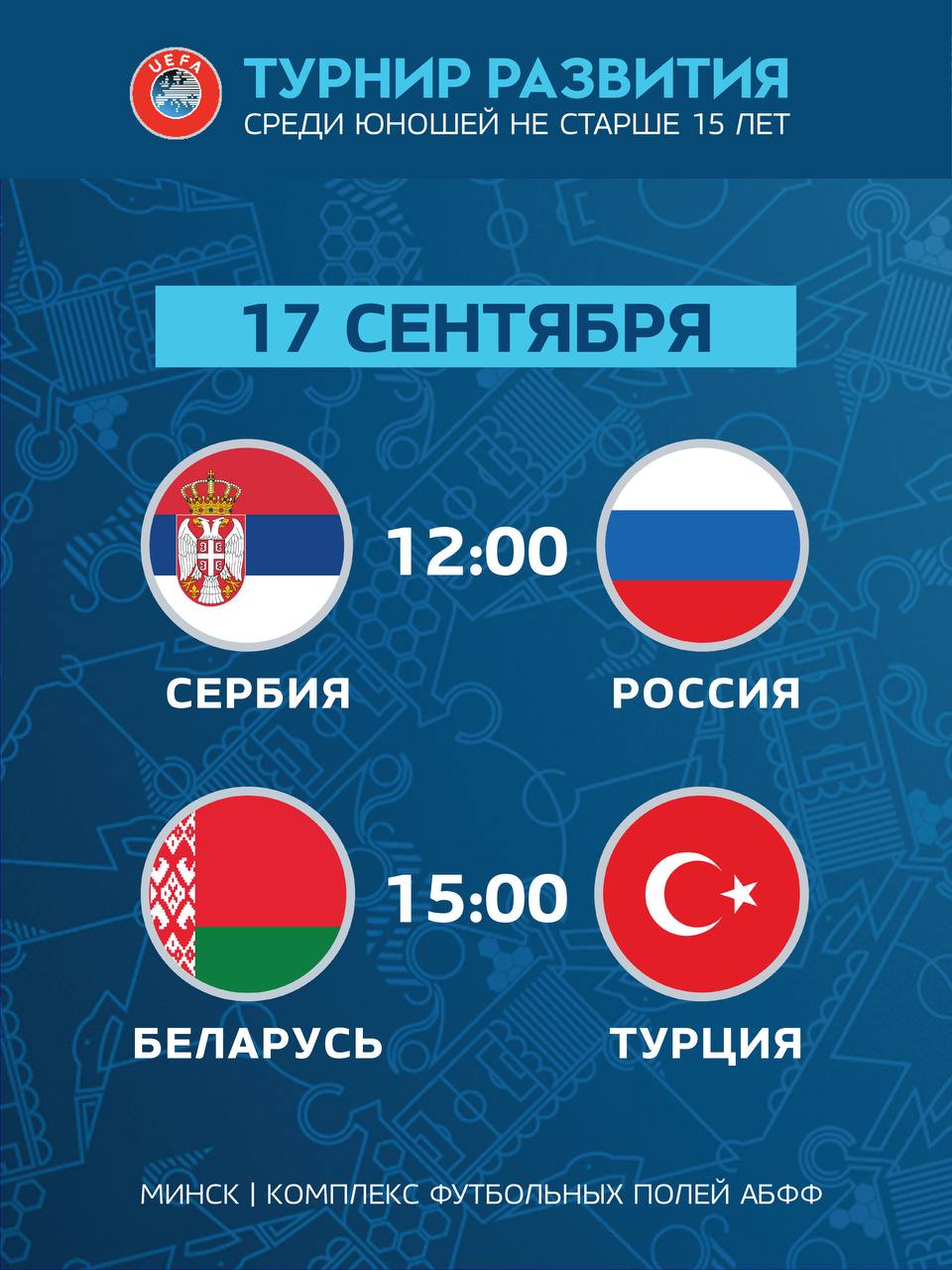 В 12.00 начнется первый поединок, в котором сборная Сербии U-15 сыграет со сверстниками из России. А в 15.00 в игру вступит сборная Беларуси U-15. В соперниках — юноши из Турции.