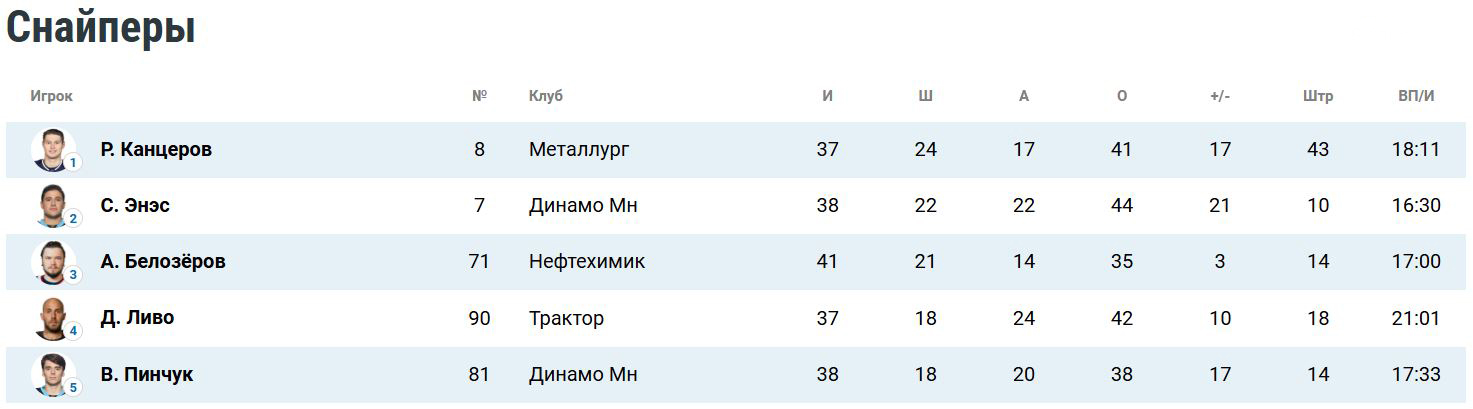 Энас с 44 очками (22+22) теперь занимает чистое второе место в топе бомбардиров лиги, отставая от российского форварда «Металлурга» Владимира Ткачева на три балла (47) и опережая канадского нападающего «Трактора» Джошуа Ливо на два (42).