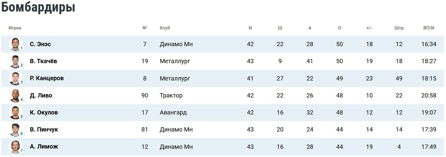 Белорусский форвард «зубров» Виталий Пинчук располагается на шестом месте в топе бомбардиров и на пятом — в топе снайперов.