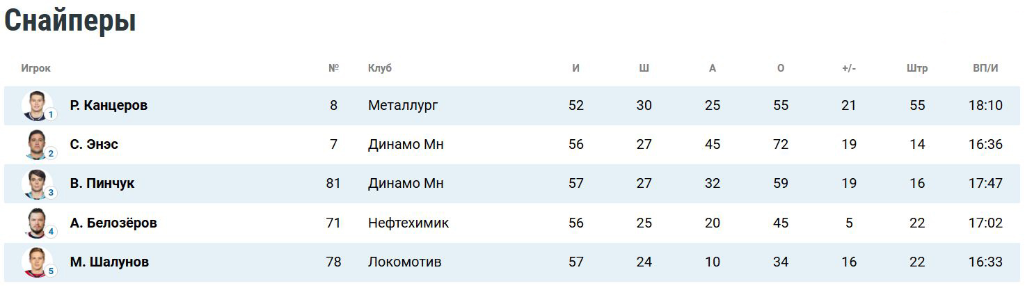 Белорусский нападающий «зубров» Виталий Пинчук располагается на пятом месте в топе бомбардиров и на третьем — в топе снайперов.