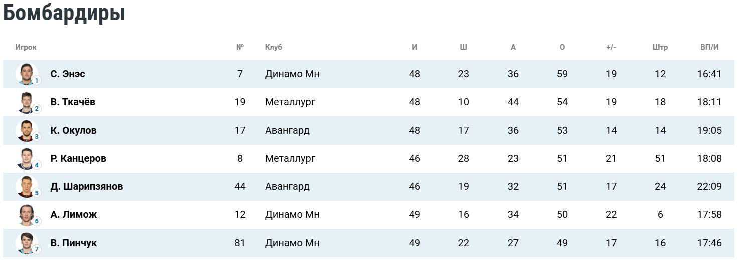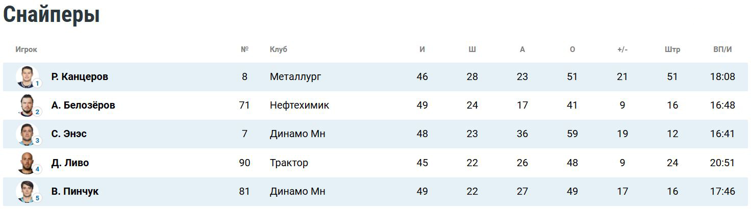 Белорусский нападающий «зубров» Виталий Пинчук располагается на седьмом месте в топе бомбардиров и на пятом — в топе снайперов.