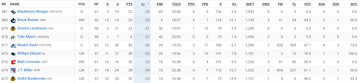 Среди всех игроков лиги этот показатель ниже только у двух хоккеистов: у одноклубника Егора Шаранговича из «Калгари» Маккензи Уигера (-35) и товарища Никиты Толопило по «Ванкуверу» Брока Бесера (-33).
