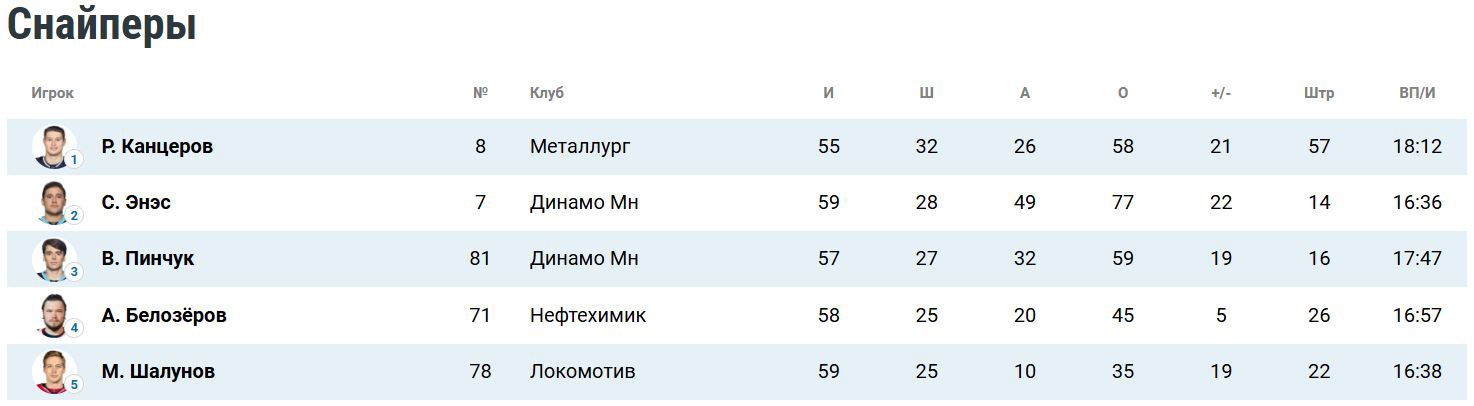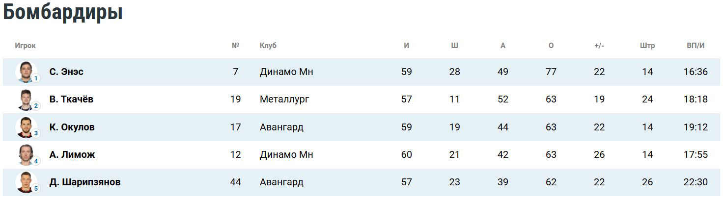 Энас продолжает лидировать в топе лучших бомбардиров КХЛ: 77 (28+49) очков после 59 игр. У преследователя Владимира Ткачева из «Металлурга» 63 (11+52) балла.
