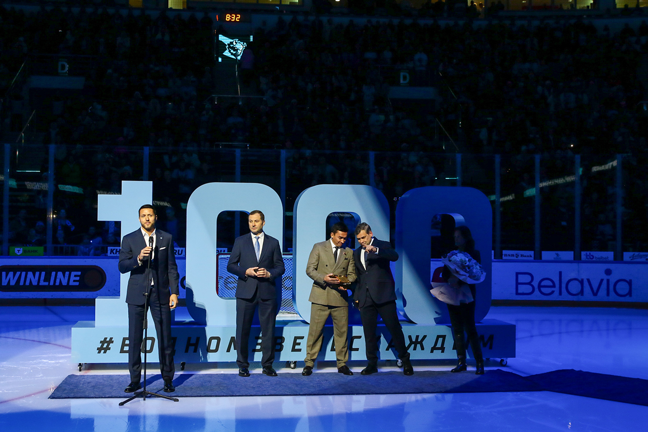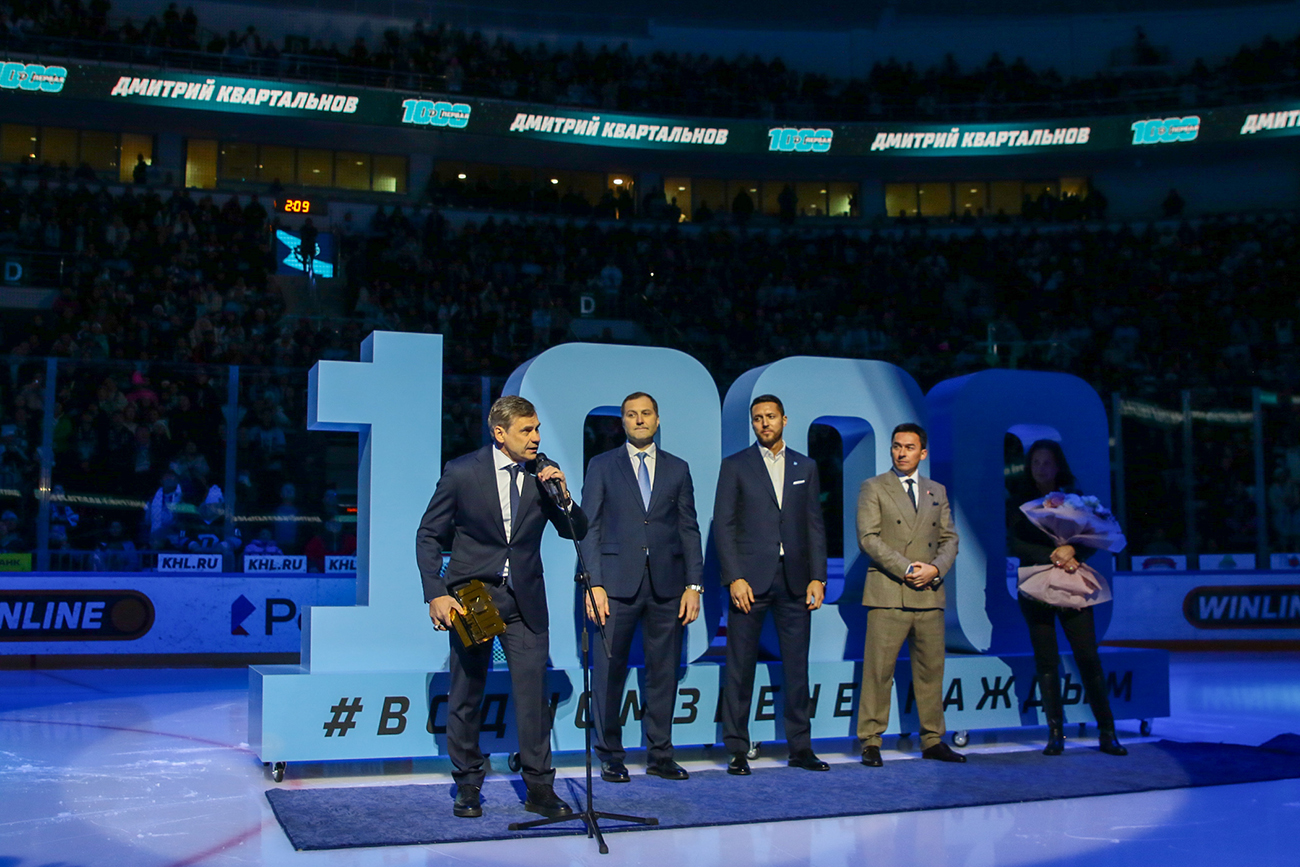 Перед матчем «Динамо» Минск — «Динамо» Москва состоялась церемония награждения главного тренера хозяев Дмитрия Квартальнова по случаю его 1000-го матча в КХЛ.