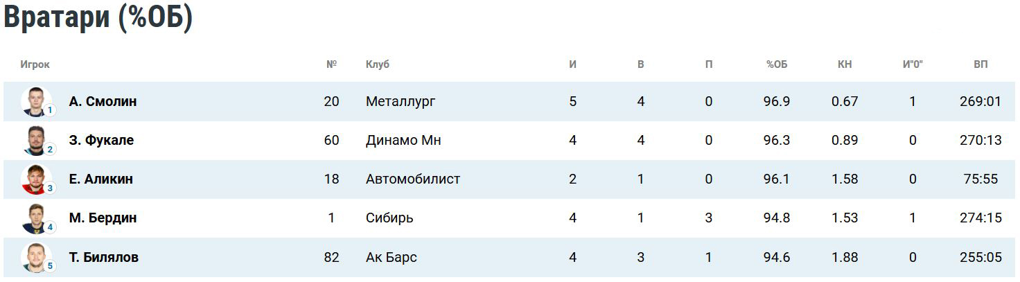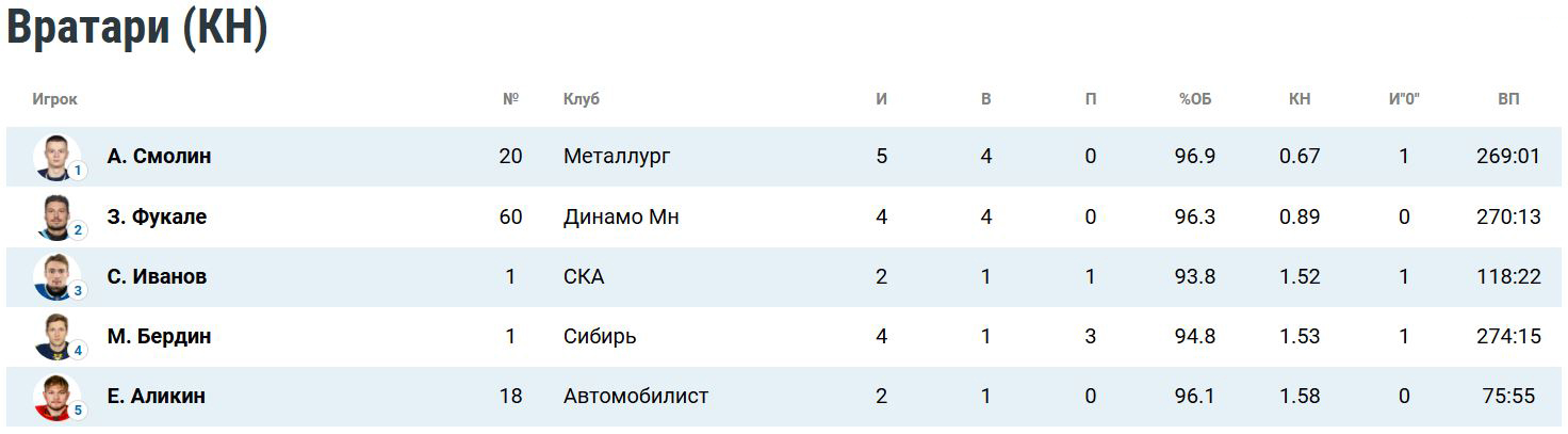 Лидирует по обоим показателям 22-летний российский вратарь магнитогорского «Металлурга» Александр Смолин, у которого 96.9% и 0.67 соответственно за пять встреч против «Сибири».