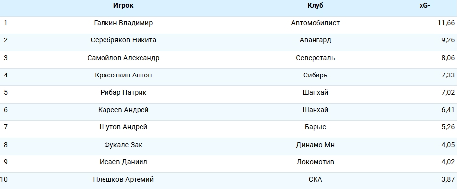 КХЛ обнародовала статистические данные текущего чемпионата. По вратарскому показателю xG-, отображающему разность между ожидаемыми и реальными пропущенными голами, лидирует Владимир Галкин из «Автомобилиста», в тройку вошли Никита Серебряков из «Авангарда» и Александр Самойлов из «Северстали».