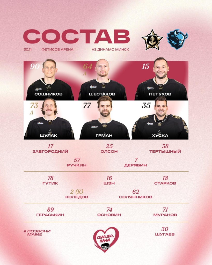 В воскресенье, 30 ноября, в матче регулярного чемпионата КХЛ минское «Динамо» в гостях сыграет против «Адмирала». Поединок во Владивостоке начнется в 10.00 по белорусскому времени.
