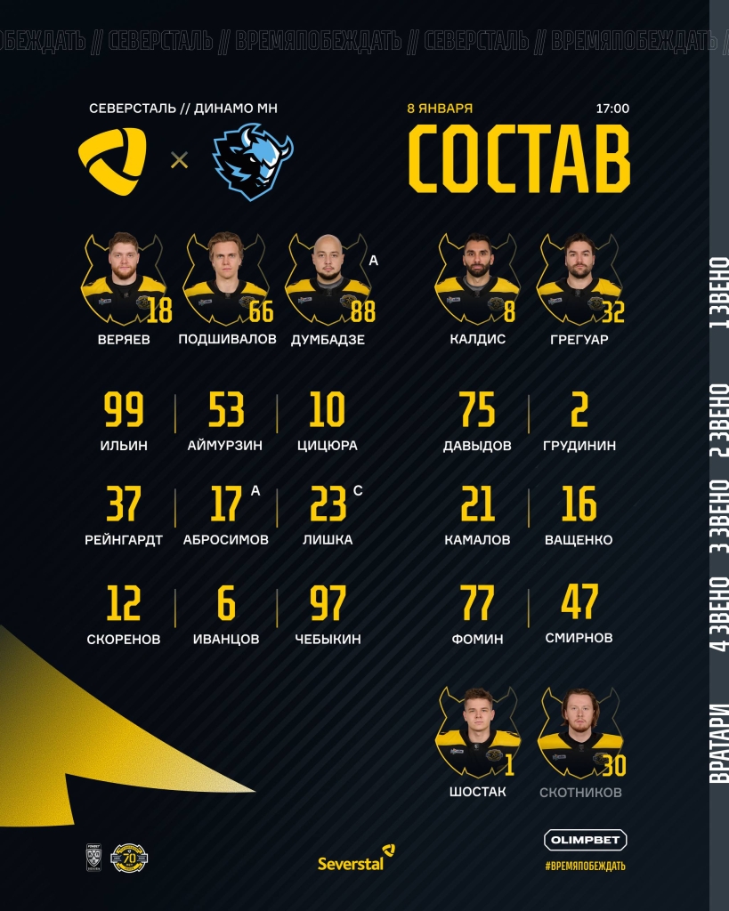 В четверг, 8 января, в очередном матче регулярного чемпионата КХЛ минское «Динамо» в гостях сыграет с «Северсталью». Поединок пройдет в Череповце и начнется в 17.00.