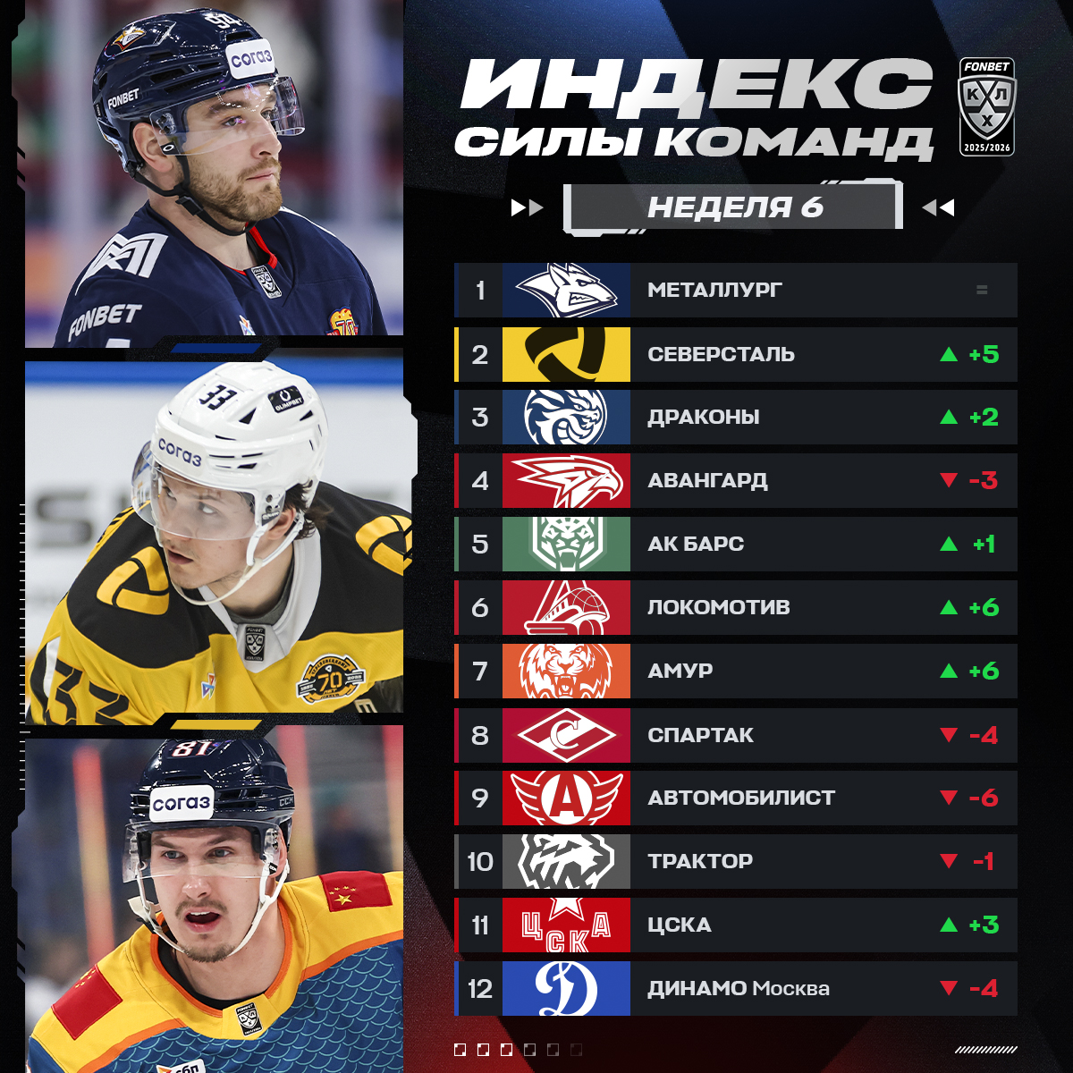 Официальный сайт КХЛ представил рейтинг самых «горячих» команд по итогам шестой недели сезона 2025/2026 КХЛ.