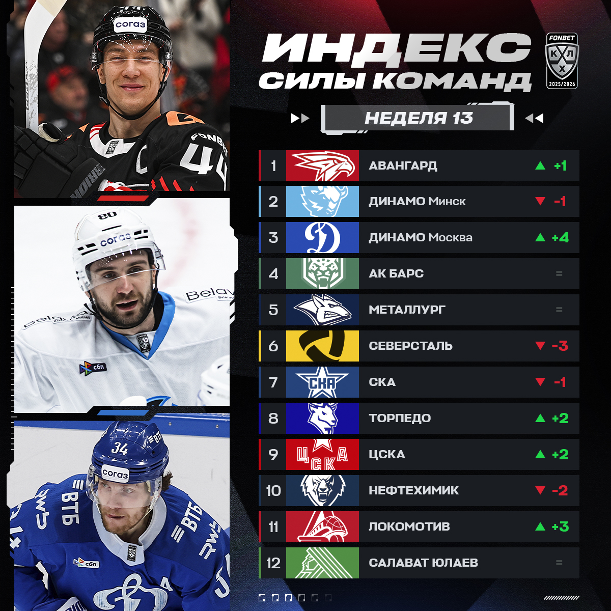 Сайт КХЛ представил рейтинг самых «горячих» команд по итогам 13-й недели сезона 2025/2026.