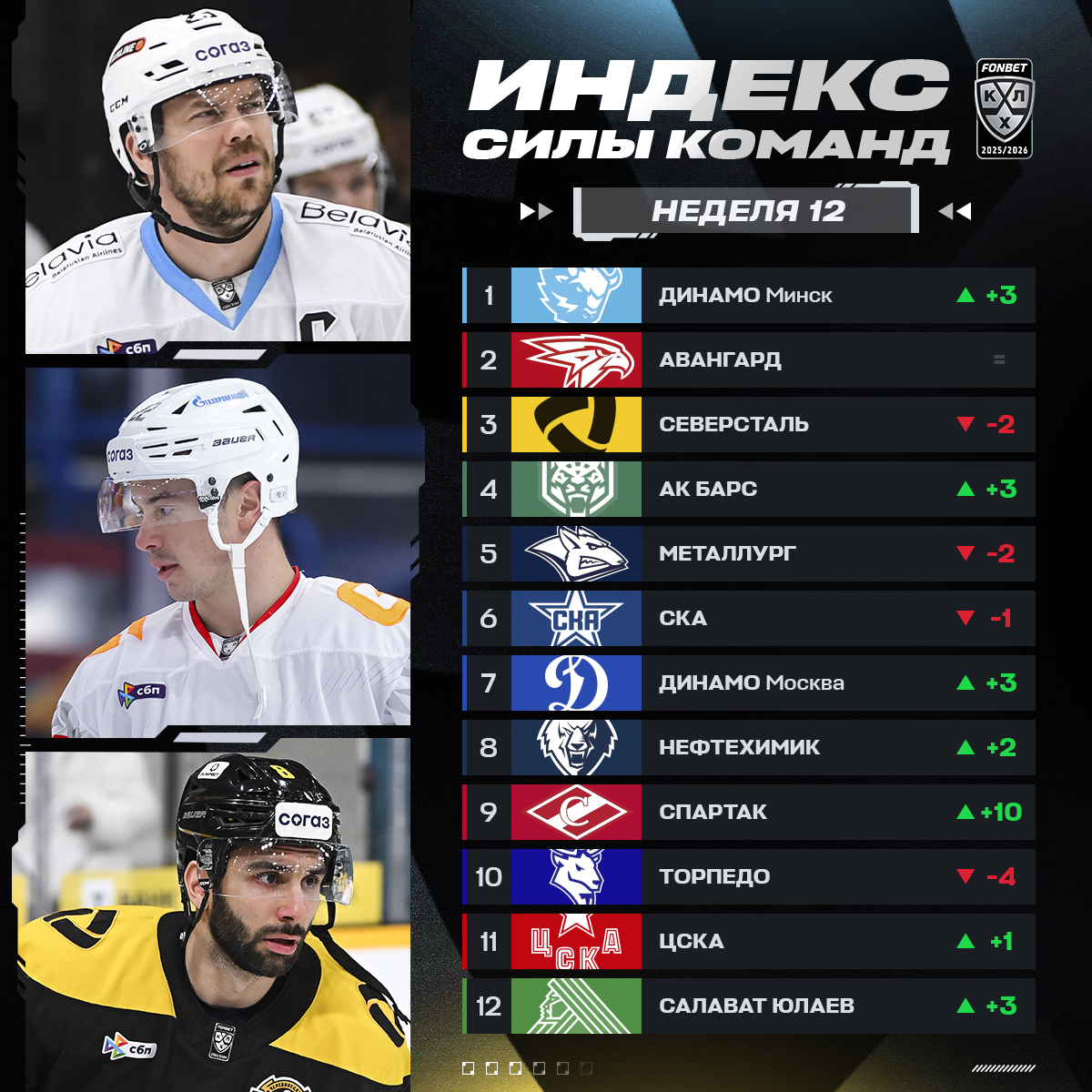 КХЛ представила рейтинг самых «горячих» команд по итогам 12-й недели сезона 2025/2026 КХЛ. Индекс силы возглавило минское «Динамо», поднявшись сразу на три строчки.