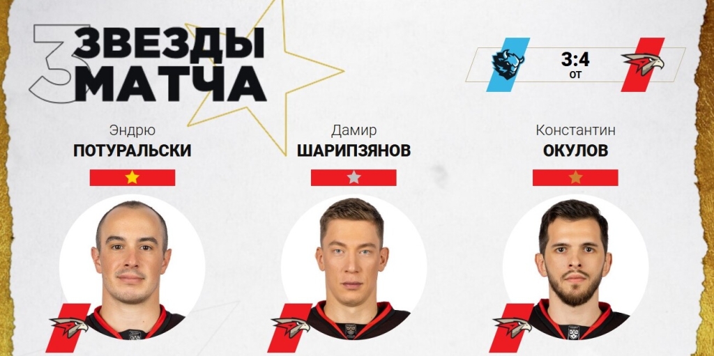 Первая звезда — Эндрю Потуральски («Авангард»). Сделал дубль (вторая его шайба стала победной), нанёс четыре броска в створ, выиграл 67% вбрасываний (12 из 18).