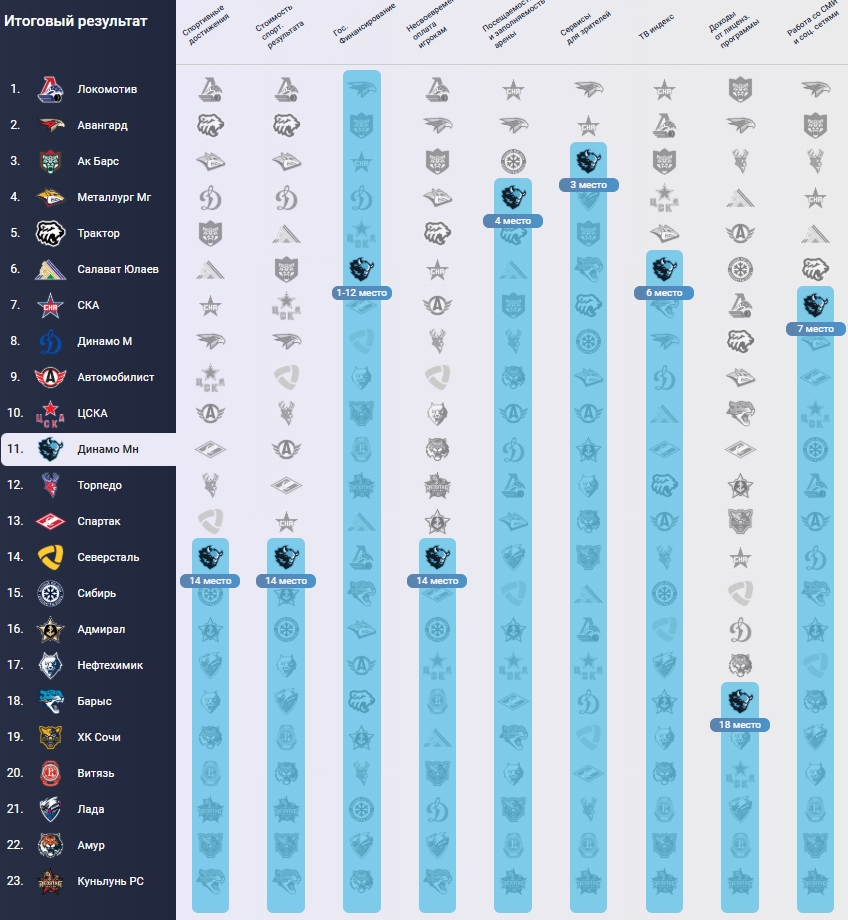 Итоговая оценка формировалась из сумм оценок по девяти параметрам, сообщает пресс-служба КХЛ: спортивные достижения (20%) и стоимость спортивного результата (20%), государственное финансирование (10%) и несвоевременная оплата труда хоккеистов (5%), посещаемость и заполняемость арен (10%), сервисы для зрителей (5%), ТВ-индекс (10%), доходы от реализации лицензионной и билетной программы, питания (10%), работа со СМИ и активность в социальных сетях (10%).