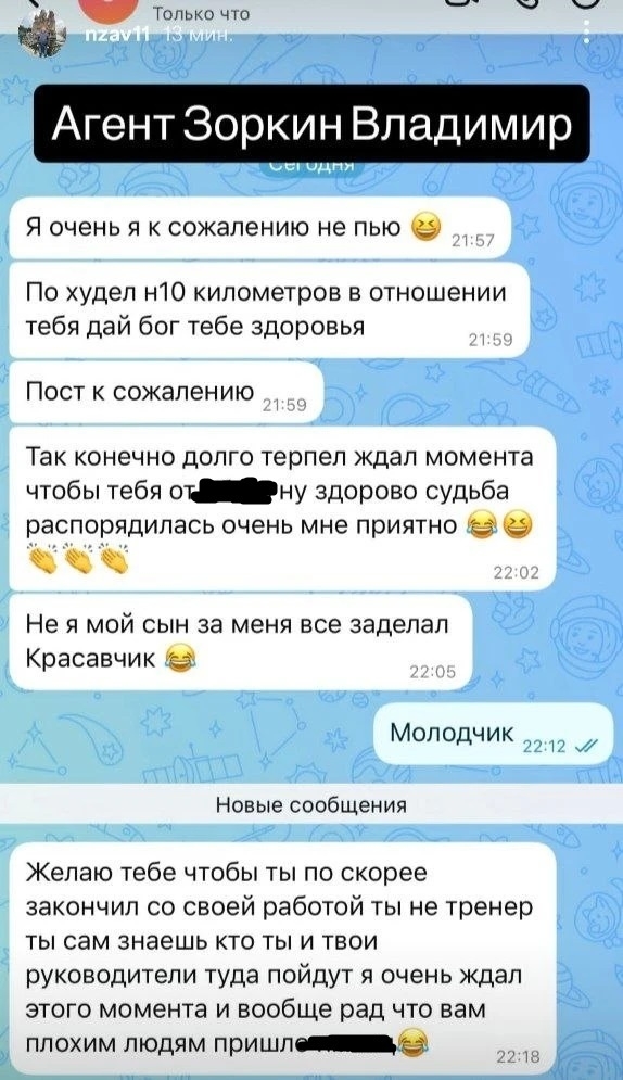 — Желаю тебе, чтобы ты поскорее закончил со своей работой. Ты не тренер, ты сам знаешь, кто ты… И вообще рад что вам плохим людям пришел п*****, — написал Зоркин.