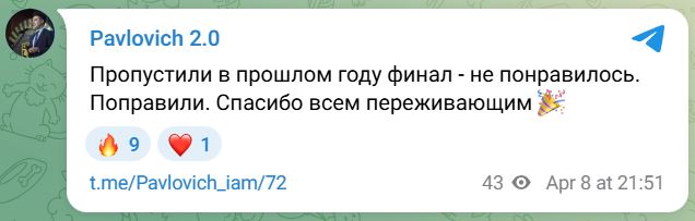 — Пропустили в прошлом году финал — не понравилось. Поправили. Спасибо всем переживающим, — написал Павлович в соцсетях.
