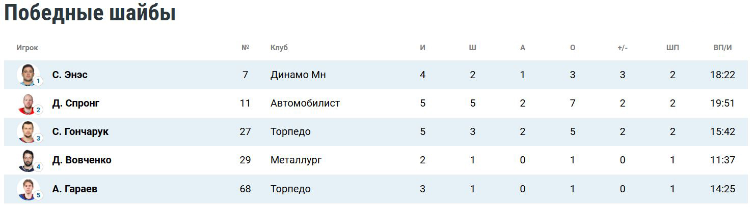 Также по две победные шайбы у Даниэля Спронга из «Автомобилиста» и Сергея Гончарука из «Торпедо», однако за пять встреч.