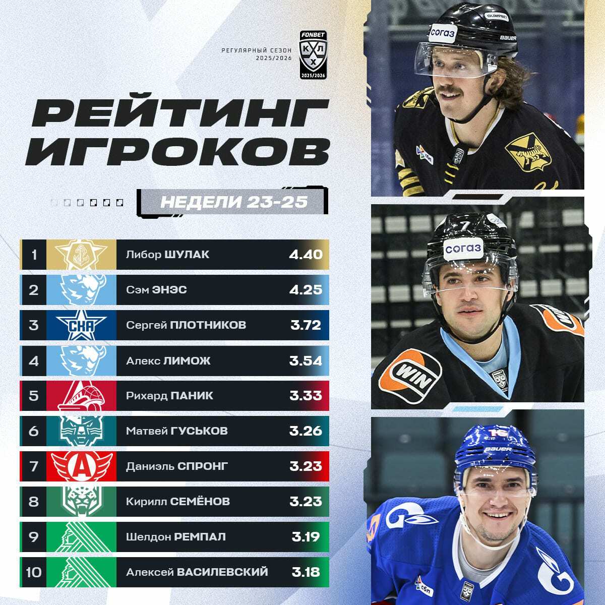 Сэм Энас с рейтингом 4.25 расположился на 2-м месте (неделю назад он возглавлял список лучших). Его партнер по звену Алекс Лимож (3.54) занимает 4-ю позицию. Возглавляет же новый рейтинг лучших игроков лиги защитник «Адмирала» Либор Шулак (4.40).