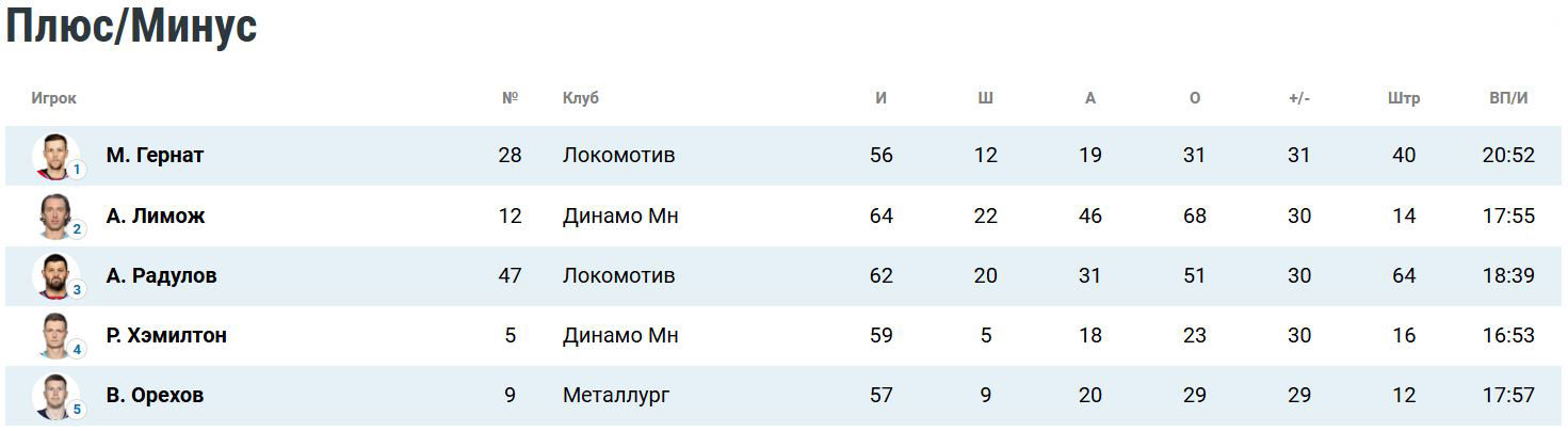 Американский нападающий «Динамо» Алекс Лимож и канадский защитник «зубров» Роберт Хэмилтон на втором и четвертом местах соответственно (по 30).