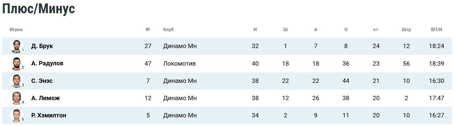 На первом месте в топе канадский защитник «зубров» Джошуа Брук (24), который опережает российского форварда-ветерана Александра Радулова (23) из «Локомотива».