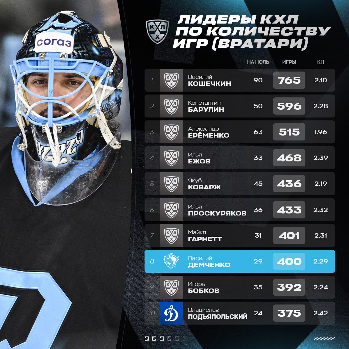31-летний вратарь сыграл 400 (29 из них – сухих) матчей в КХЛ и лишь на один матч отстает от седьмого места.