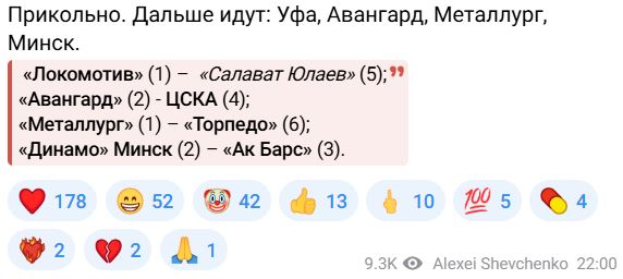 — Прикольно. Дальше идут: Уфа, «Авангард», «Металлург», Минск, — написал Шевченко.