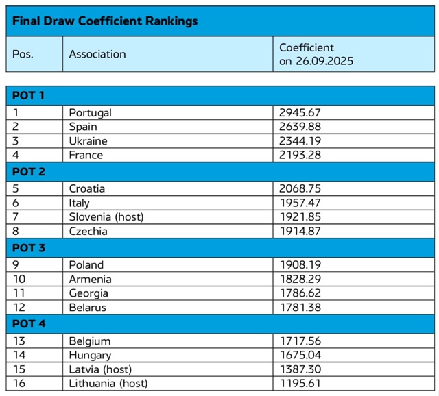 В ходе жеребьевки будут составлены четыре группы по 4 команды — «А» (будет базироваться в Латвии), «В» (в Литве), «С» и «D» (в Словении). Три позиции в группах уже забронированы за хозяевами: А1 — Латвия, В1 — Литва, С1 — Словения. Они в жеребьевке принимать участия не будут.