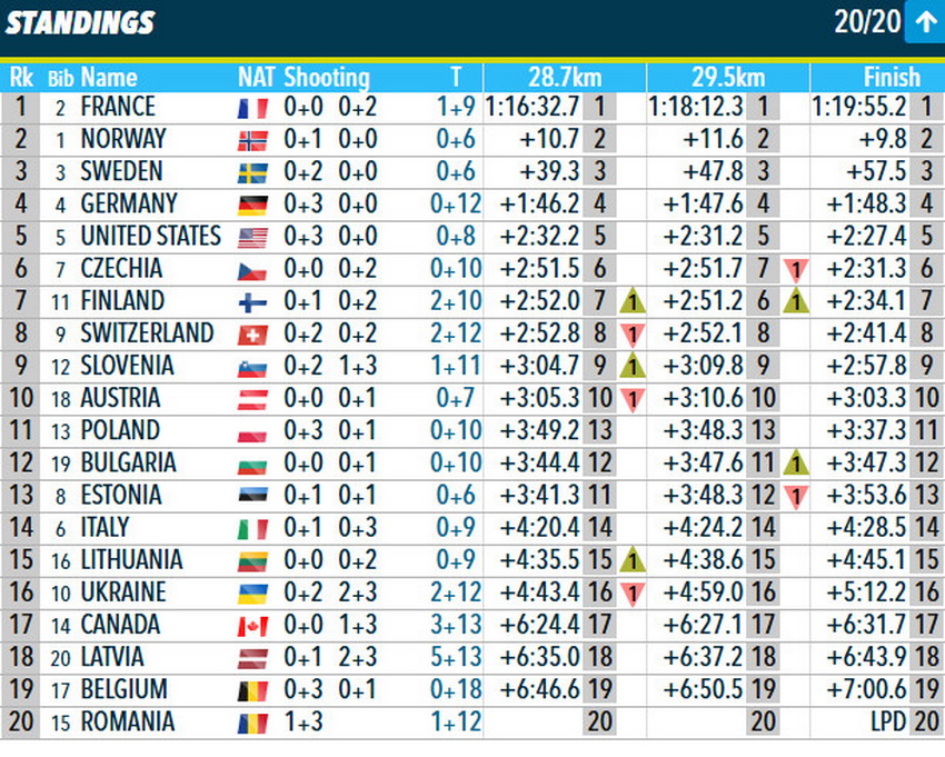 1.Франция (Фабьен Клод, Эмильен Жаклен, Кентен Фийон Майе, Эрик Перро) – 1:19.55,2 (1 штрафной круг + 9 дополнительных патронов).