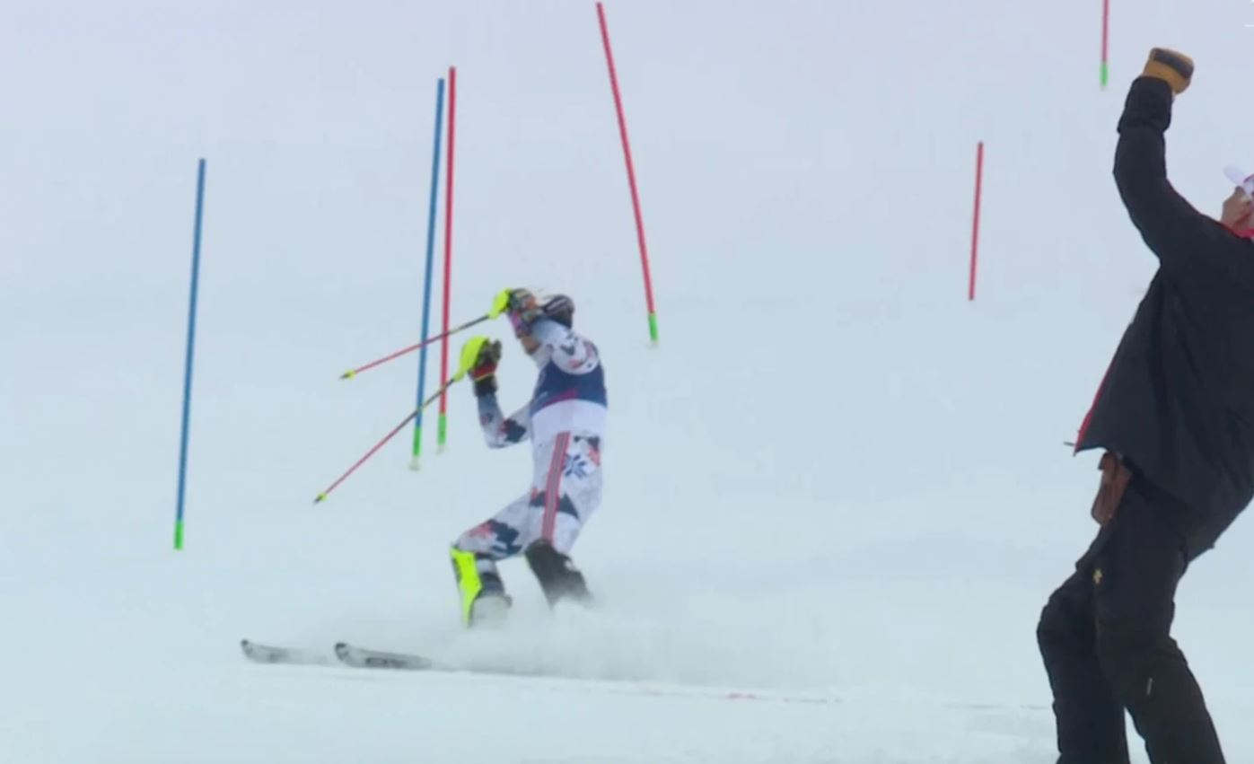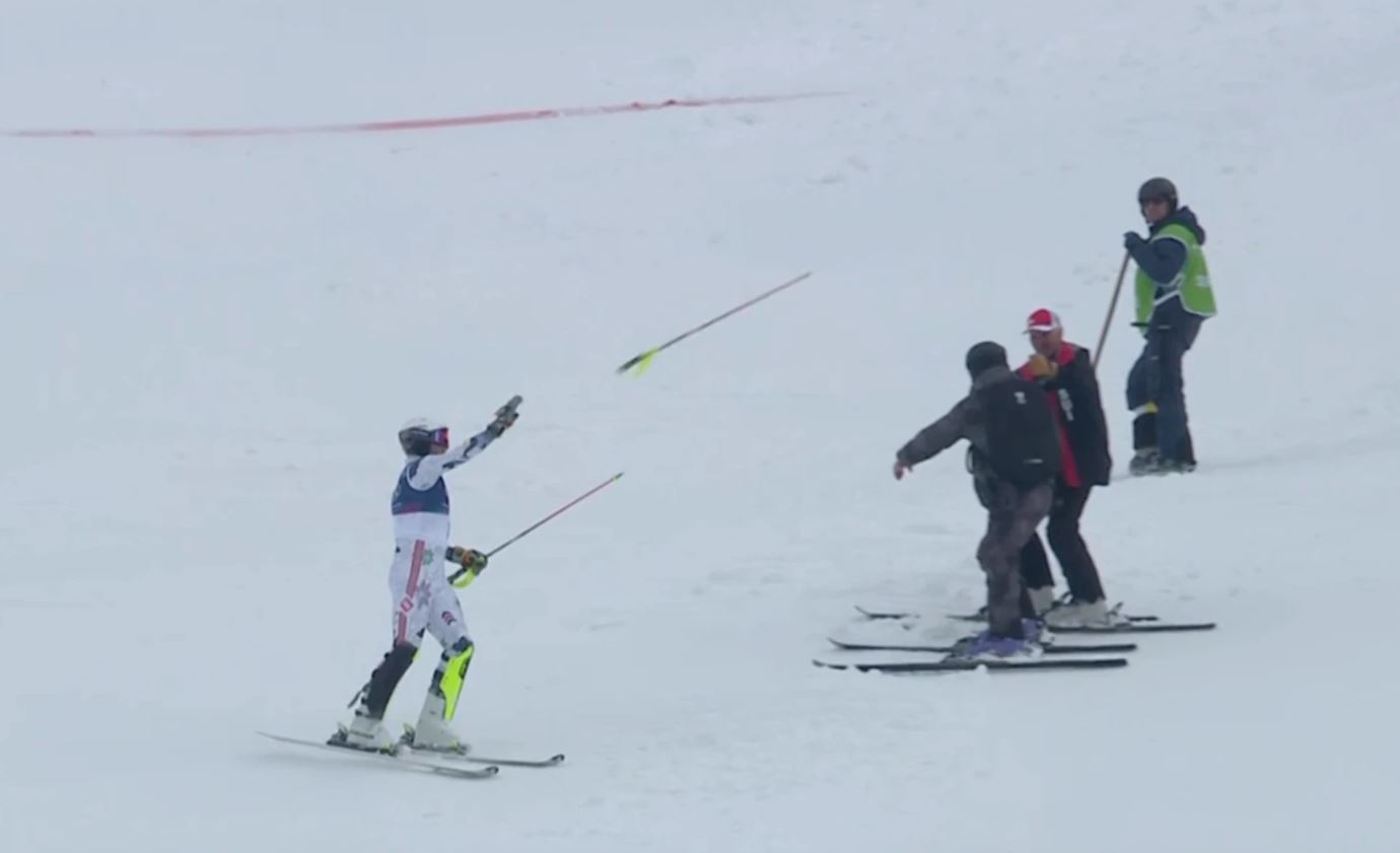 25-летний норвежец допустил грубую ошибку во второй решающей попытке, пропустив ворота и сойдя с трассы. Огорченный, он покинул финишную зону, по пути выбросив лыжи и палки, и направился к лесному массиву, где лег в снег.