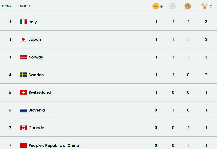 По итогам дня первое место в медальном зачете Игр разделили сборные Италии, Японии и Норвегии. В активе каждой команды по три медали (одна золотая, одна серебряная и одна бронзовая).