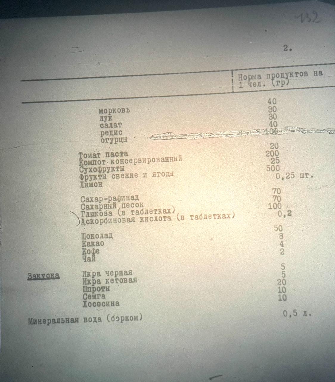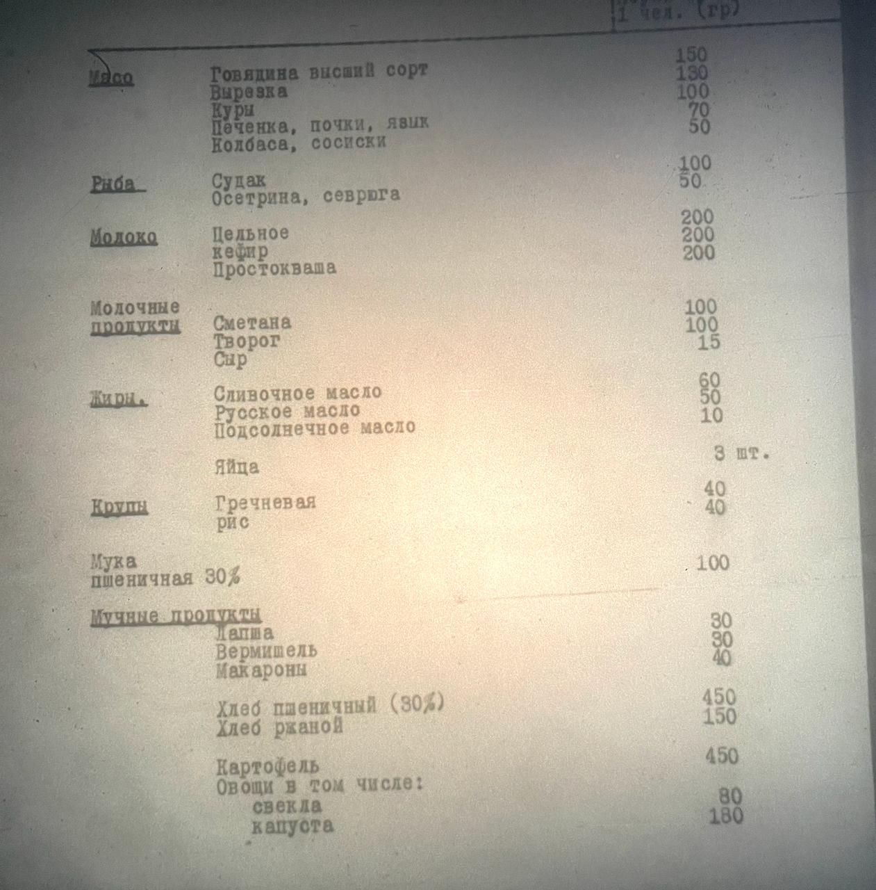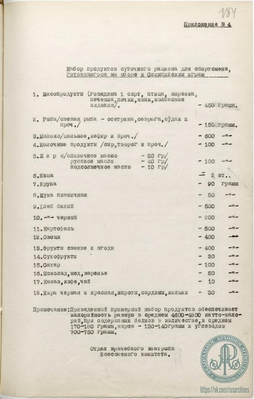 На первом скане из РГАСПИ (Российского государственного социально-политического архива) — набор питания суточного рациона для спортсменов, готовящихся на сборах к Олимпиаде (то есть, на территории СССР).