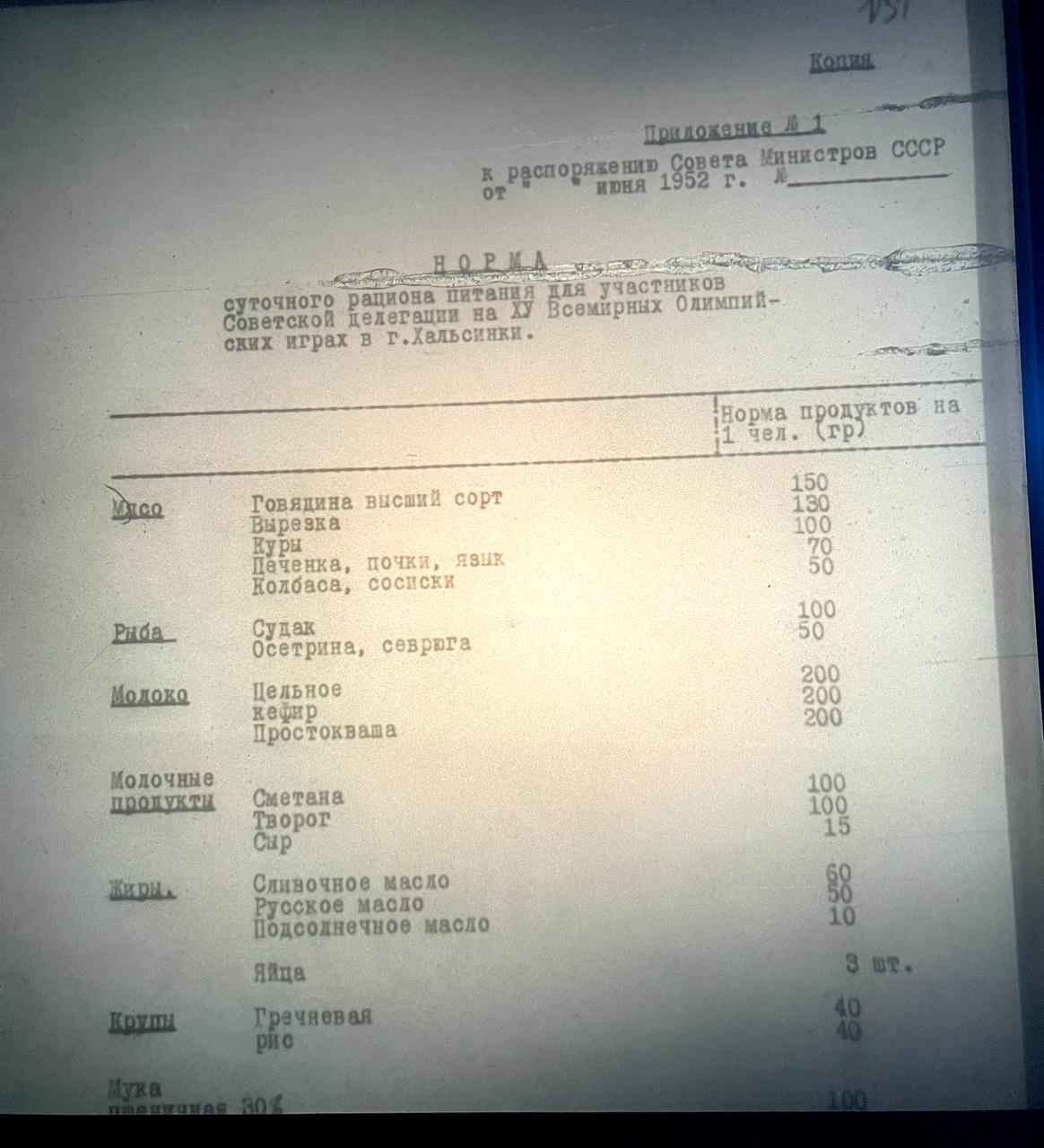 Все эти материалы по питанию спортсменов на Олимпиаде-1952 хранятся в РГАСПИ — фонд 17, опись 132, дело 571″, — сообщил Гридасов в своем ТК.