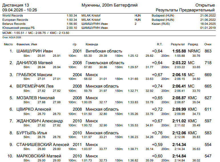 На проходящем сейчас в Минске открытом чемпионате Беларуси по плаванию представитель Витебской области Иван Шамшурин обновил национальный рекорд на дистанции 200 метров баттерфляем — 1 минута 55,88 секунды. Примечательно, что прежнее достижение принадлежало ему же и было улучшено более чем на секунду — 1.56,90.