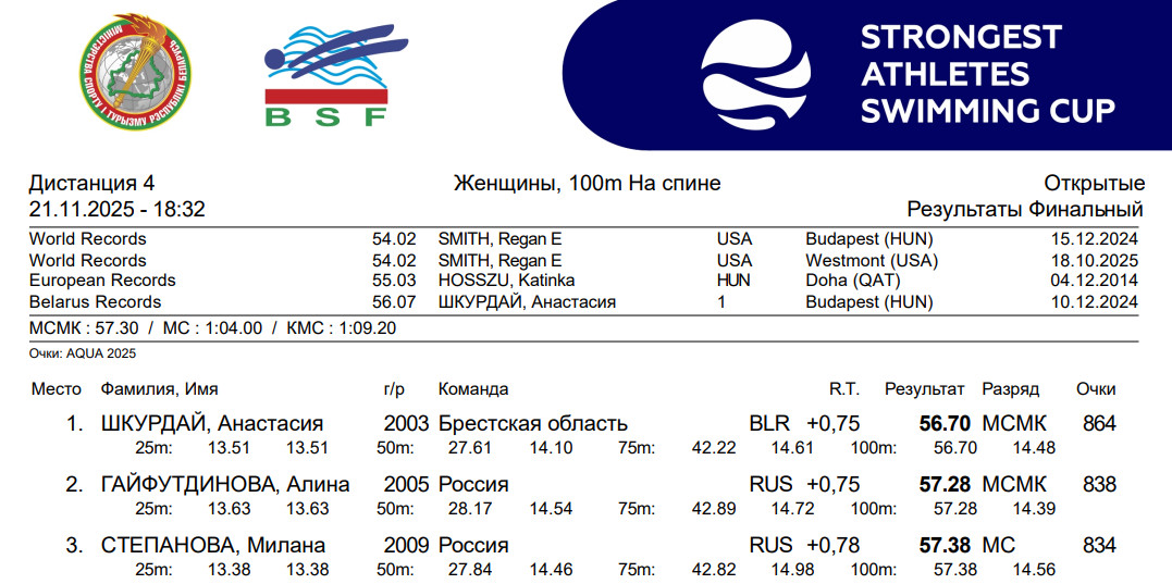 На Кубке сильнейших, который проходит в столичном 25-метровом бассейне международного стандарта, Шкурдай победила на дистанции 100 метров на спине, показав в финале 56,70 секунды.