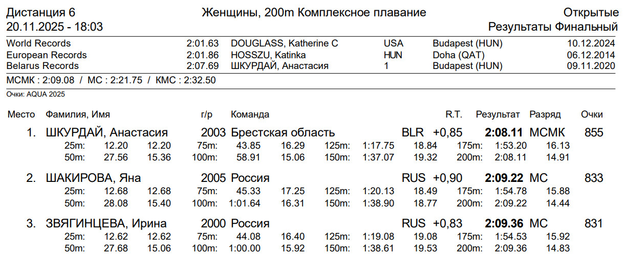 На Кубке сильнейших, который проходит в столичном 25-метровом бассейне международного стандарта, Шкурдай победила на дистанции 200 метров комплексным плаванием, показав в финале результат 2 минуты 08,11 секунды.
