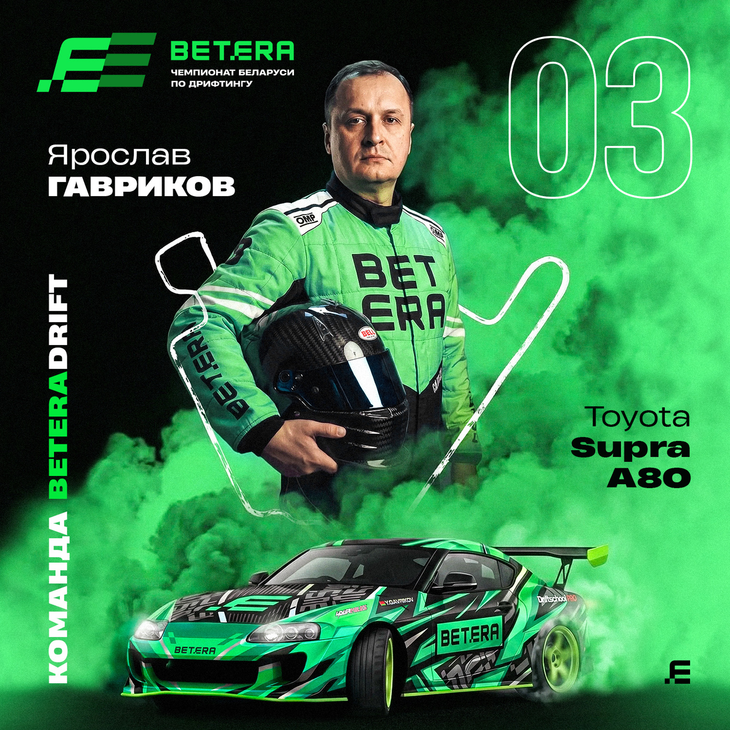 В 2026 году сезон дрифта станет еще интереснее — новые команды, новые пилоты и автомобили, повышение уровня организации и накала борьбы. Обновления не обошли и Betera Drift team: из прошлогоднего состава в команде остался Ярослав Гавриков – чемпион на Toyota Supra A80. Усиление — не менее яркое. Ряды “зеленой” команды пополнили вице-чемпион 2025 года Антон Поздняков и амбициозный пилот Михаил Гацко. Что известно о пилотах Betera Drift team?