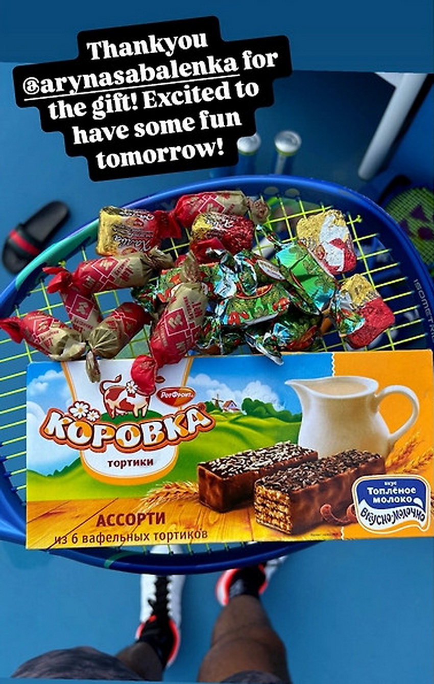 Кирьос поблагодарил белорусскую теннисистку за российские сладости, сопроводив пост соответствующей фотографией. Он добавил, что с нетерпением ожидает предстоящего мероприятия под названием «Битва полов».